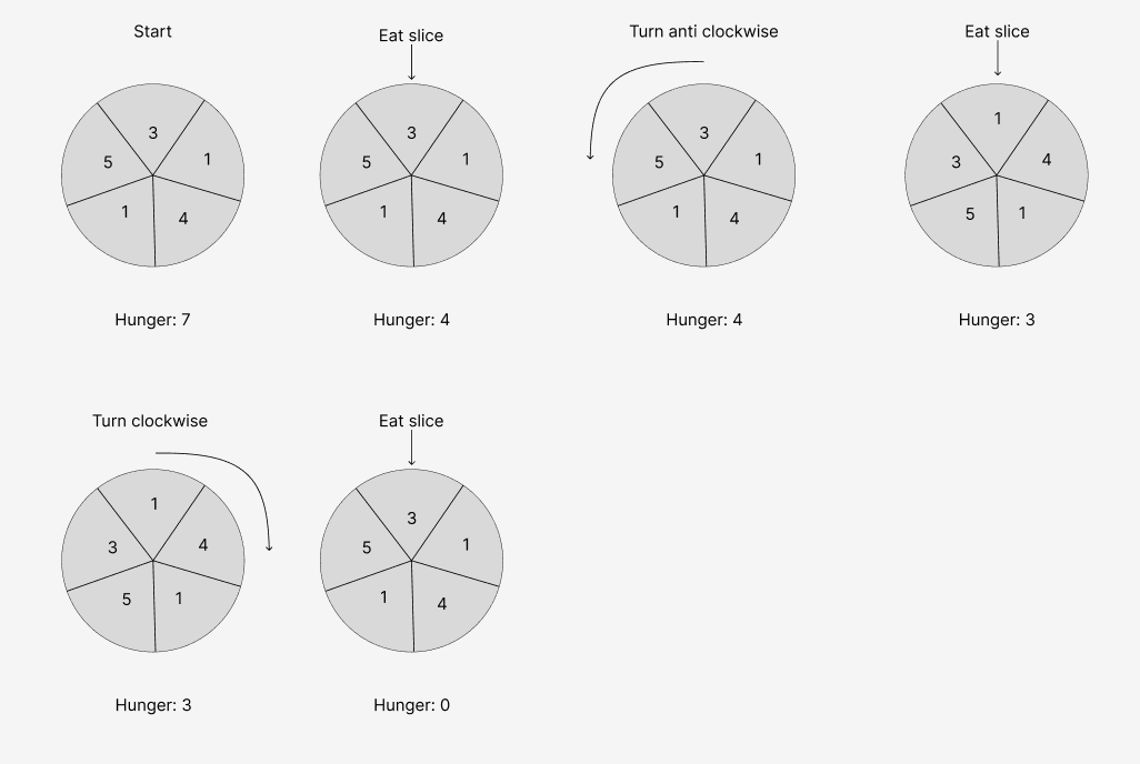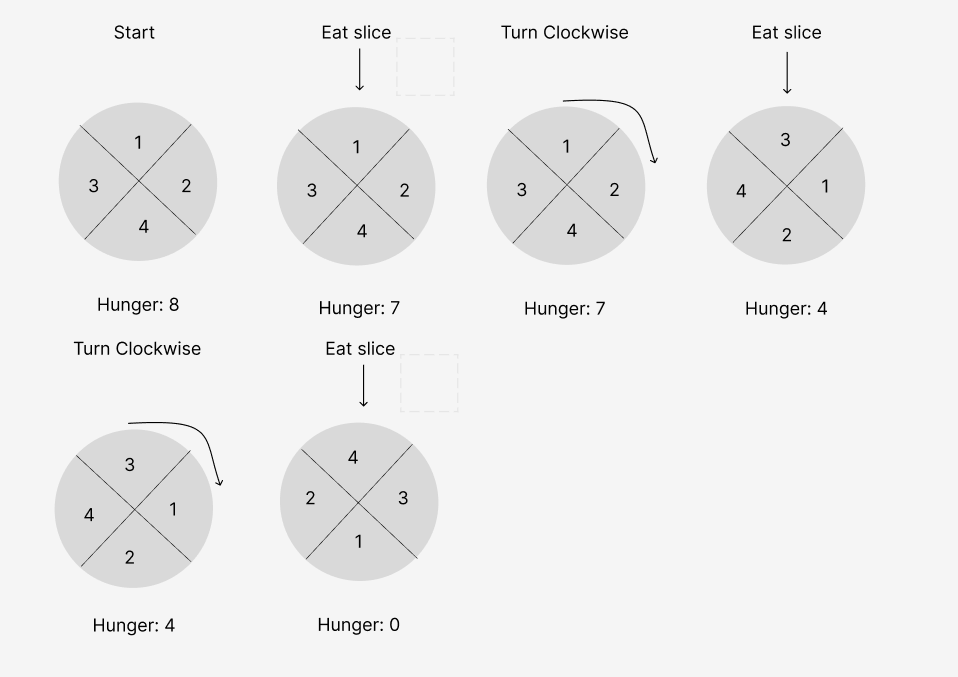 - You can only eat a slice that is directly clockwise or anticlockwise of the one you just ate.