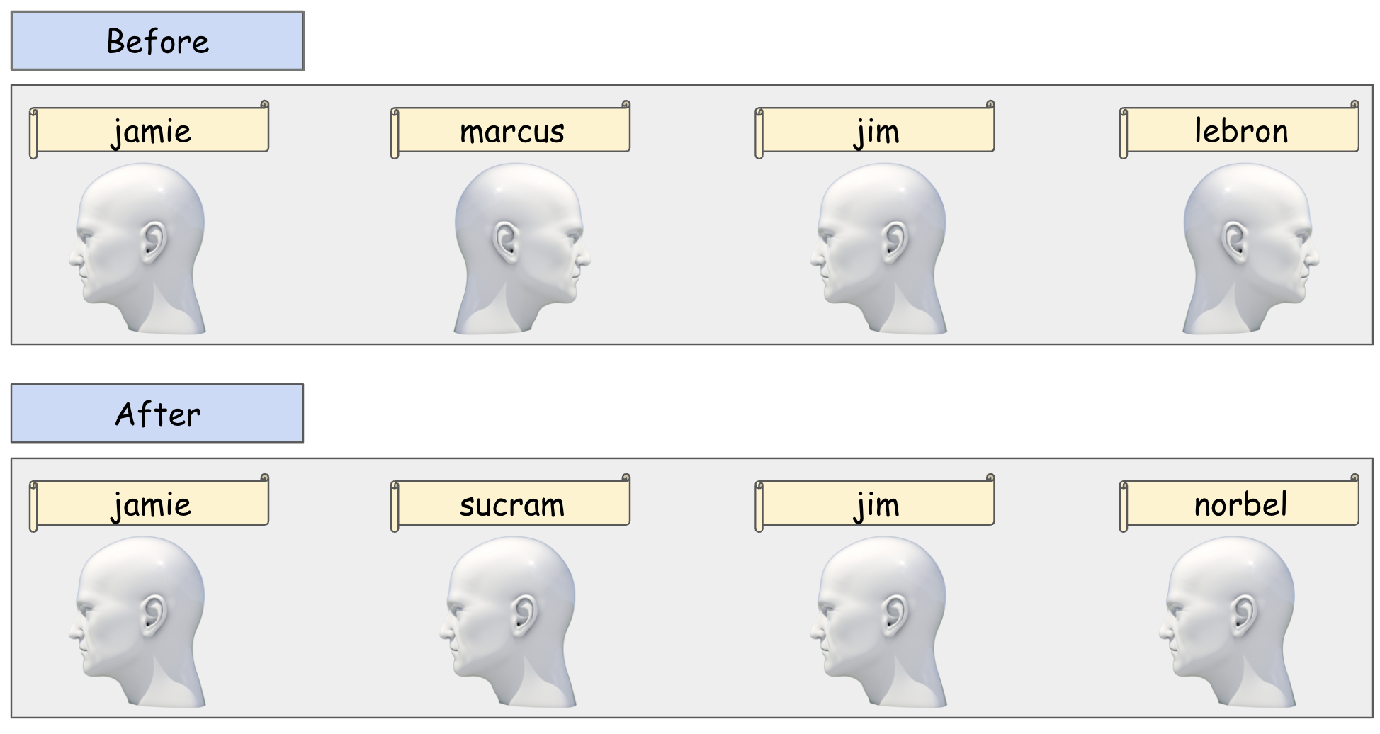 The direction of a head on the shelf is determined by its name tag.